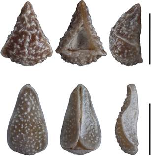 Johnstonella diplotricha es una especie fácilmente distinguible debido a que posee clusas enmarcadas por un fino margen alado; además, se caracteriza por la cara dorsal tuberculada y finamente granulada (Fig. 3B).