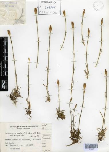 Both a diagnosis and a detailed description were given for P. patagonica, as well as the provenance (“Hab. In pratis glareoso-sabulosis ad ostia Rio Gallegos, Aug. [August] 1882 (C. S.) [Carlo Spegazzini]”. Spegazzini’s herbarium and types are deposited at LP and LPS, with additional material at various other herbaria (Stafleu & Cowan, 1985). Three specimens of P. patagonica, collected by C. Spegazzini in 1882 at Rio Gallegos, where traced: LP003080, K000486387, and NY99342591. These three specimens are part of the original material of Philippiella patagonica and a lectotypification is necessary since no holotype was indicated by Spegazzini in the protologue. Since LP003080 bears better preserved plants is here designate as the lectotype of the name; K000486387 and NY00342591 are considered as isolectotypes. These three specimens match the protologue and correspond to the current concept of the species (Pedersen, 1984).