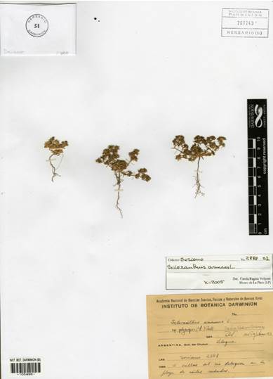 The genus Scleranthus L. includes approximately 12 species native to Eurasia and Australasia; some taxa are introduced in North and South America, South Africa, and east Asia (Hernández-Ledesma et al., 2015). According to Zuloaga et al. (2008, 2019), the Flora of Argentina includes one species of Scleranthus, S. annuus L., introduced in Buenos Aires, Chubut, Córdoba, La Pampa, Neuquén, and Río Negro. Among the specimens examined at SI, two of them [barcodes SI1054496 (Fig. 2) and SI105633] are here identified as S. polycarpos L. (a taxon recognized at species rank according to Marhold, 2011), based on the length of the fruit, the position of the sepals, and the length of internodes. Therefore, S. polycarpos is a casual alien species in Argentina, occurring in Buenos Aires and Chubut Provinces.
