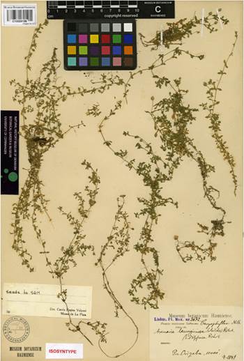 Thanks are due to Directors and Curators of the Herbaria cited. Special thanks to I. Friis and O. Ryding (Herbarium C) for sending original material of Liebmann’s vars. diffusa, ensifolia, and megalantha of Arenaria lanuginosa and helping me in the interpretation of the original labels. I. Friis and O. Ryding (Herbarium C) and M. Iberite (Herbarium RO) give me the permission to reproduce the images of the lectotypes of, respectively, Arenaria lanuginosa vars. diffusa/ensifolia/megalantha (C) and A. palustris var. humilior/Saponaria hispanica (RO).
