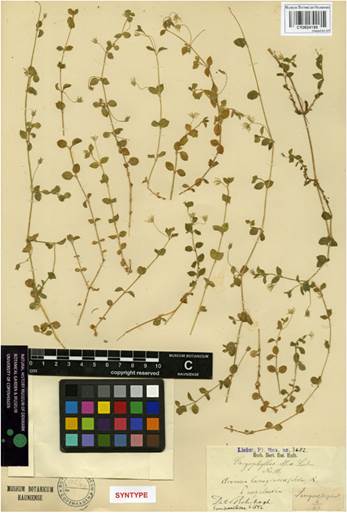 Cesati (1871: 4) proposed this variety to separate forms of Arenaria palustris Phil. with shorter and wider flowers (“floribus brevioribus latioribusque”). He actually referred to plants observed (but not formally described) by Stroebel (1866: 363) who stated “Lasciata la Plaza de Armas ... scorgonsi alla sinistra ossia a nord-ovest ... tre laghetti ... dall’ultimo dei quali esce il Rio Malo [as “Molo”] ... In onta alle acque diacciate, anzi in grazia della umidità ... spuntavano fra i sassi, graziosi bianchi fiorellini …” (= Leaving the Plaza de Armas ... three little lake can see to the left, that is to the north-west ... from the last of which [lakes] flows the Rio Malo ... In spite of the frozen waters, and thanks to the humidity ... graceful white flowers appeared among the stones). Cesati’s Herbarium and types are mainly preserved at RO where one specimen bearing the following original label could be traced: “Prof. Philippi pl. chilens. [Plantae Chilenses] Ed. Dr. Hohenacker | 870. Arenaria palustris Naud.- Phil. et Griseb. | Ad litus lacus Ranco Sept. m. Jan m.”. Cesati (1871: 5) cited both Philippi and Hohenacker stating “... questa specie offertaci nella sua forma tipica dalla pianta distributita dall’Hohenacker nelle Centurie del Philippi sotto il N° 870 …” (= this species in its typic form and distributed by Hohenacker in the Philippi’s Centuiras). No names under Arenaria were published by Philippi (1858a, 1858b, 1859) and numbered with 870 in his Centurias. Rudolph Friedrich Hohenacker (1798-1874) was a Swiss-German missionary and botanist who edited many series of exsiccates between 1841 and 1874, containing plants collected by himself from South America (Chile included), Europe, and Asia (Stafleu & Cowan, 1979). According to Stafleu & Cowan (1983), Plantae Chilenses is an irregular series of exsiccatae distributed by R. F. Hohenacker, which were mainly deposited at B (now mainly destroyed during World War II) (see also Hohenacker, 1854: 268, 1858: 342).