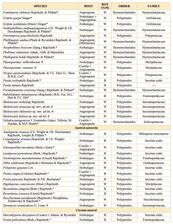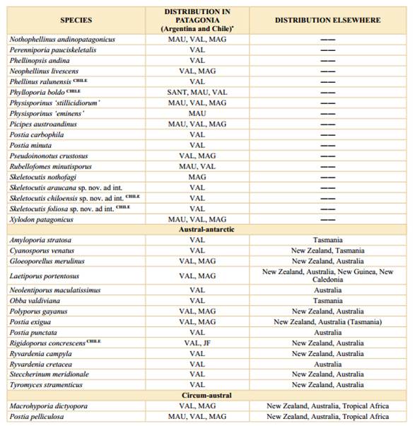Here, a critically review of the polypore taxa found in Patagonia and their distribution is presented. The aim is to establish the biogeographical distribution of these groups based on published phylogenetic studies, and to highlight the genera and species that present particular lineages and distributions.
