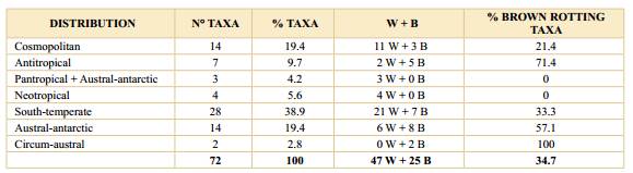 The polypore mycobiota of southern South America forests is made up of 72 species of which 25 (34.7%) are brown rotting species growing exclusively on Nothofagaceae (16 spp.), on other angiosperms and conifers (3 spp.), exclusively on angiosperms (1 sp.) and exclusively on conifers (5 spp.) (Tables 1 and 3). This is almost the same percentage reported in previous studies when only 37 (Rajchenberg, 1989) and 62 (Rajchenberg, 2006) polypore species were known and/or considered in Patagonia. The preference of brown wood-rotting species for Nothofagaceae is highlighted, especially in the South-temperate, Austral-antarctic and Circum-austral taxa, as this is in contrast with the situation of brown- rotting species in the North Hemisphere, where a preference for conifers has been repeatedly shown and is associated with the evolutionary origin of Pinaceae (Hibbett & Donoghue, 2001; García-Sandoval et al., 2011). According to García-Sandoval et al. (2011) the ‘antrodia clade’, to which many brown-rotting polypore genera and species in Patagonia belong (cfr. Table 1, under Fomitopsidaceae, Dacryobolaceae and / fibroporia+amyloporia) originated by the mid Jurassic, but genera such as Postia, Oligoporus, Fomitopsis, Laetiporus and Neolentiporus developed later, by the mid Cretaceous. Similarly, the Gloeophyllales originated by the early Cretaceous but taxa in Gloeophyllum only appeared by the late Cretaceous/early Cenozoic (García-Sandoval et al., 2011, Fig. 4).