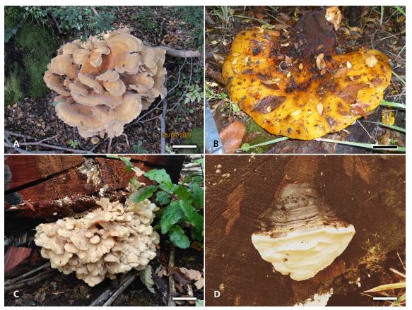 Grifola gargal (Fig. 1C) and G. sordulenta: there is no phylogenetic treatment for these two Patagonian species yet, but sequences have been included by Gargano et al. (2020) in a treatment of G. frondosa (Dicks.) Gray. Ongoing research and preliminary results show that these two taxa are each phylogenetically related to taxa from Australia and New Zealand, respectively, showing a complex evolutionary history. They grow on different Nothofagaceae; G. gargal on N. obliqua and G. sordulenta on N. dombeyi. Grifola gargal has also been found on the exotic Populus nigra showing its capacity to ‘jump’ to different hosts (Pozzi et al., 2009); in Chile it has also been recorded on N. dombeyi, Weinmannia trichosperma and Eucryphia cordifolia (Jansen & Schalkwijk, 1979) but those records need confirmation (Rajchenberg, 2002).