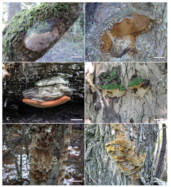 Fomitiporia chilensis (Fig. 2A): this taxon is phylogenetically related to the Neotropical lineage of the Fomitiporia punctata (P. Karst.) Murrill species complex (Rajchenberg et al., 2019), the nearest taxa being F. neotropica Camp.- Sant., Amalfi, R.M. Silveira, Robledo & Decock (Campos Santana et al., 2014) described and recorded from the humid rainforest in French Guiana, the semi-deciduous Atlantic Forest in S Brazil, and the subtropical, seasonally drier forests of NE Argentina, and F. imperceptaMorera, Robledo & Urcelay (Morera et al., 2017) described from Central Argentina and from French Guiana. The whole group presents a Wide Neotropical phylo-biogeographic distribution.