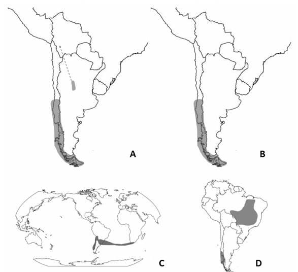 Arambarria cognata (Fig. 2F): this taxon was originally confused with the N Hemisphere Inocutis jamaicensis (Murrill) A.M. Gottlieb, J.E. Wright & Moncalvo (Rajchenberg, 2006) but, afterwards, it was recognized as an independent southern phylogenetic lineage at the genus level and described as A. destruens Rajchenb. & Pildain (Rajchenberg et al., 2015), a name that showed to be a synonym of A. cognata. This species presents a temperate to subtropical distribution in S South America, present in Patagonian Chile and Argentina, but up to Central Chile, and in Argentina along the Andes to Central Argentina and northwards into the Yungas forests; it is also present in Uruguay and possibly also in southern Rio Grande do Sul (Brazil) (Pildain et al., 2017). Its phylo-biogeography is of the South Amazonian type. It is noted that an undescribed taxon in Arambarria Rajchenb. & Pildain has been recognized from South Africa (Pildain et al., 2017; Reid, 1955), which makes this small genus to present a particular distribution of possible West- Gondwanan origin (McLoughlin, 2001) (Fig. 3C).