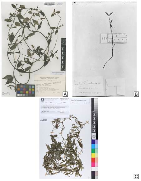 El tratamiento nomenclatural se basó en el análisis de los protólogos y en el estudio de material original conservado en los herbarios B, BM, CGE, CORD, CTES, E, F, G, GH, GOET, K, LE, LIL, M, MBM, MICH, MO, MPU, NY, OXF, P, PH, RB, S, SI, TDC, U, UC, US, W (acrónimos según Thiers, 2022). Para proceder con las tipificaciones se siguieron las reglas del Código Internacional de Nomenclatura para algas, hongos y plantas (ICN; Turland et al., 2018). Las tipificaciones están organizadas alfabéticamente por nombres de especies aceptadas de Manettia, de acuerdo con los tratamientos para la flora de la Argentina y de Paraguay. En la selección de lectotipos, siempre que se eligiera entre sintipos (Art. 9.6 del ICN), se seleccionó el que mostró la mejor calidad de conservación de las características diagnósticas del taxón. Para los casos en que el material original se extravió o destruyó y no se hubieren encontrado duplicados (9.13 del ICN; Turland et al., 2018), se designó un neotipo siguiendo las recomendaciones del Art. 9.8 - 9.16 del ICN; se estudiaron rigurosamente los ejemplares seleccionados tal que presenten las características mencionadas en los protólogos y se condigan geográficamente con el área en que fueran coleccionadas originalmente. Para los casos que fue necesario corroborar la caligrafía presente en un ejemplar, se consultó la base de datos “Auxilium ad botanicorum Graphicem” (https://www.ville-ge.ch/ musinfo/bd/cjb/auxilium/).