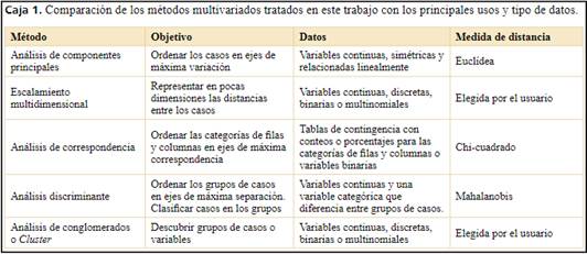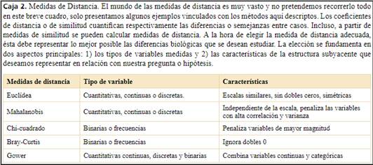 Al mismo tiempo, estas técnicas difieren en el tipo de datos que pueden procesar (Caja 1): para Componentes Principales son variables cuantitativas, para Análisis de Correspondencia son tablas de contingencia, como frecuencias, porcentajes o medidas de presencia y ausencia de caracteres (con o sin pubescencia, por ejemplo). En cambio, para Escalamiento Multidimensional no hay restricción en el tipo de variables ya que este método permite elegir la medida de distancia que se va a utilizar en el ordenamiento. Esto lo hace muy versátil porque existe una gran variedad de medidas de distancia que admiten diferentes tipos de datos además de permitir ponderar diferentes aspectos de la semejanza/ diferencia entre objetos (Caja 2). Para el Análisis Discriminante la matriz de datos podría ser idéntica a la de Componentes Principales, pero debe comprender además una variable de tipo categórica que indica el grupo de pertenencia para cada objeto. En un ejemplo de taxonomía, las variables podrían ser medidas morfométricas (variables cuantitativas) que serían utilizadas para la caracterización de diferentes taxones (variable categórica) con la finalidad de generar una regla automática para la identificación taxonómica de nuevos ejemplares (Christodoulou et al., 2020).