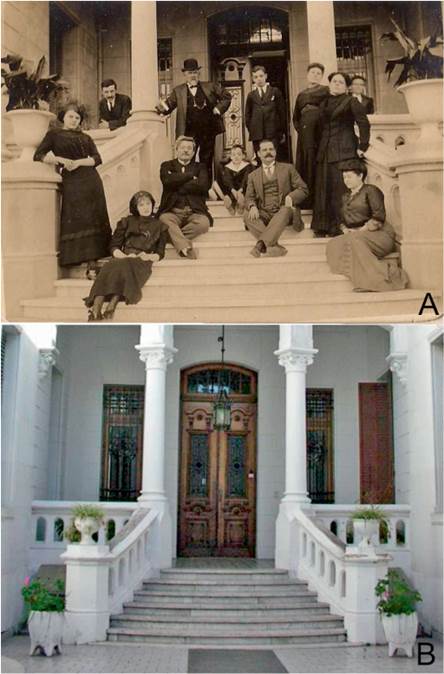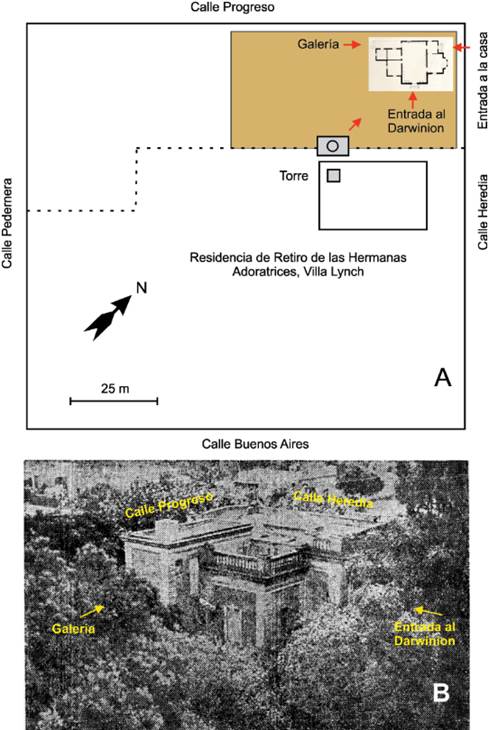 El Instituto de Botánica Darwinion nació como el laboratorio particular de Cristóbal M. Hicken (Anónimo, 1912; Ducros Lenatz, 1936; Parodi, 1961). Su primera sede fue construida en la actual Villa Lynch (ex Villa Progreso), partido de San Martín. Según el historiador del partido de San Martín, Roberto Conde, el edificio del Darwinion se construyó en un terreno de casi media hectárea sobre la calle Progreso entre Heredia y Pedernera (Conde, 2014). Sin embargo, el decreto de aceptación de la donación (Decreto 40.581 del 19 de abril de 1934) establece que el terreno de Villa Progreso tenía 2361,60 m2 (casi un cuarto de hectárea), y el texto de la donación al Estado Nacional incluido en el testamento de Cristóbal M. Hicken detalla que el terreno tenía 35,19 m sobre la calle Heredia y 67,12 m sobre la calle Progreso (Burkart, 1939a), medidas que coinciden con la superficie ya mencionada. Estos datos son particularmente confiables, no solo por el carácter legal del texto, sino también porque Cristóbal M. Hicken era Agrimensor (Ducros Lenatz, 1936). De acuerdo con Conde (2014), la casa del Darwinion se ubicaba más cerca de la mitad de cuadra, pero el estudio de las fotografías del exterior del edificio sugiere que se encontraba cerca de una esquina. Por estas razones se deduce que el terreno de Villa Progreso donde se construyó el primer Instituto de Botánica Darwinion ocupó la esquina sur del cruce de las calles Heredia y Progreso (Fig. 1), que en la actualidad linda hacia el sureste con la Casa de Retiros de las Hermanas Adoratrices (congregación que se instaló allí en 1928, en un edificio que anteriormente estuvo ocupado por las Carmelitas de la Caridad). De acuerdo con algunas publicaciones (Ducros Hicken, 1942; De Vita, 2021), y al relato del Sr. Mariano Ducros (com. pers.), Christian Hero Hicken (padre de Cristóbal) tenía una propiedad (la quinta familiar) en Villa Progreso. La comparación de la puerta principal de esta quinta familiar (ca. 1911, foto cortesía del Sr. Mariano Ducros) con la entrada de la Casa de Retiros de las Hermanas Adoratrices (Fig. 2) reveló que se trata de la misma construcción, ubicada sobre la calle Heredia. De lo anterior se deduce que el primer Darwinion se construyó en un terreno lindero a la quinta familiar de Christian Hero Hicken, propiedad que luego pasaría a las Carmelitas de la Caridad entre 1922 y 1927, y finalmente a las Hermanas Adoratrices en 1928. Esto explica el comentario de la nota del diario La Razón del 6 de noviembre de 1922 sobre una comida formal ofrecida en la quinta familiar de Christian Hero Hicken: “En un intervalo de la reunión, los invitados pasaron al Darwinion del doctor Cristóbal Hicken…”.