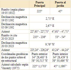 El estudio de la orientación de un edificio o monumento es un tema complejo que requiere del trabajo de especialistas. En este artículo se presenta una primera aproximación a este aspecto, con el propósito de dejar planteada una posible profundización en trabajos futuros sobre este tema. Para establecer la orientación del edificio se aplicó la metodología sugerida por Prendergast (2015) para el cálculo del azimut sobre la base de coordenadas geodésicas, y también el método magnético. El eje estructural del edificio está claramente indicado en el plano original de la planta, y también sobre el piso del portal y de la terraza de acceso a la puerta principal. Para la primera metodología, se tomaron las coordenadas geodésicas de dos puntos sobre ese eje separados unos 60 m. Las mediciones se realizaron con un GPS Garmin Colorado 300 y se utilizó la herramienta en línea del sitio web https://geodesyapps.ga.gov.au/vincenty-inverse que calcula el azimut directo e inverso con la fórmula de Vincenty (1975). Para la segunda metodología, se tomó el rumbo del eje estructural con una brújula electrónica y una brújula lensática. Para el cálculo del azimut se consultó la declinación magnética en https://www.ngdc.noaa.gov/geomag/calculators/magcalc.shtml. Se siguieron los conceptos sugeridos por Prendergast (2015) para distinguir entre orientación (dirección de una estructura o eje respecto del azimut local) y alineación (orientación intencional de un monumento o estructura). Ante la posible relación entre la orientación del eje estructural del edificio con el simbolismo solsticial, se compararon los valores de azimut de este eje con el azimut del sol en el amanecer y el ocaso (crepúsculo civil matutino y vespertino) de los solsticios de 1932, año de la presentación de los planos e inicio de la construcción del edificio de San Isidro. Los valores del azimut del sol para esas fechas y esos momentos del día se tomaron del sitio https://gml.noaa.gov/grad/solcalc/. Para observar la posible orientación del eje estructural del Darwinion con estrellas o constelaciones se utilizó la aplicación en línea Stellarium (https://stellarium-web.org/) con la cual se recreó el cielo nocturno poco antes del amanecer y poco después del ocaso (crepúsculo náutico matutino y vespertino) de los solsticios y equinoccios de 1932. Establecer con precisión la altura del horizonte visible alrededor del Darwinion hacia 1932 demanda una tarea de recreación histórica del vecindario que excede el propósito de este trabajo. Sin embargo, realizamos una primera aproximación de la altura del horizonte a través de las puertas del portal del Darwinion para un observador ubicado de pie en el centro del portal.