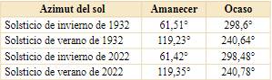 Dra. MaríaVictoriaAlonso, Investigadora Independiente, Instituto de Astronomía Teórica y Experimental, CONICET, y al Lic. Armando Mudrik, Universidad Nacional de Córdoba, Observatorio Astronómico de Córdoba, Miembro del grupo de investigación Estructura galáctica y Medio Interestelar, Coordinador del Centro de Interpretación Científica “Plaza Cielo y Tierra”, por su asesoramiento en los cambios del azimut del sol a los largo del año.
