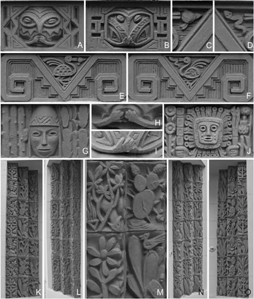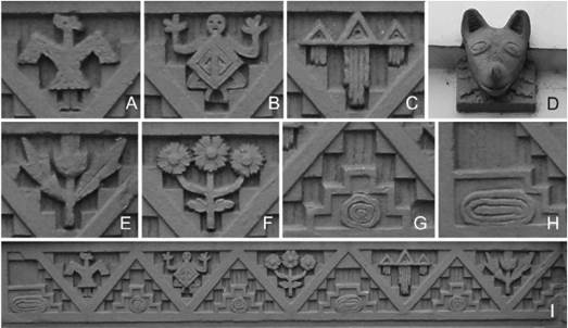 Respecto a las grecas escalonadas que separan las figuras de este friso nos remitimos a la obra de Posnansky (1913) donde refiere el significado y la omnipresencia del “signo escalonado” en el arte tihuanacota. Posnansky sostiene que las líneas zigzagueantes son los ideogramas del cielo y la tierra, surgidos en las oscuras noches de tiempos remotísimos en las que los rayos atravesaban el cielo tormentoso del altiplano. Entre flores y animales, se alterna el trueno que ruge (espirales), anticipando las lluvias (Quiroga, 1901) y el poder reproductor de la semilla (círculos concéntricos, los ojos de Imaymana, atributo del dios Viracocha) (Lafone Quevedo, 1899).