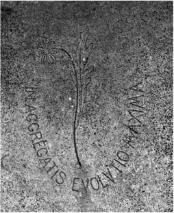 En el plano original de la planta del Darwinion, como también en el plano del relevamiento del Ing. Eduardo Latzina realizado para la inauguración del instituto, llaman la atención las indicaciones de la línea media de los salones del herbario y la biblioteca, su intersección en el centro del atrio con un ángulo de 90 grados, cuyo vértice es cruzado por el eje estructural del edificio a modo de bisectriz y eje de simetría (Fig. 8B y Fig. 19D). En el eje estructural del edificio puede encuadrarse la plomada, ligada siempre al nivel (Fig. 19B, observable sobre la línea media de los salones frontales), que es el instrumento que verifica la verticalidad y representa el equilibrio en la conducta y la elevación espiritual del masón. Simbólicamente ese eje es un axis mundi invisible que conecta el cielo y la tierra. El eje estructural del edificio está indicado in situ por la junta central de los bloques de roca del atrio, por el centro de las puertas de herrería artesanal del portal y por una parte de las juntas del piso. De hecho, las rocas del atrio están cortadas y dispuestas en simetría especular respecto de dicho eje. La roca con el emblema ocupa el centro, el lugar del peso de la plomada (Fig. 19E), de modo que el emblema “in aggregatis evolutio maxima” sugiere la conducta ideal del investigador del instituto.