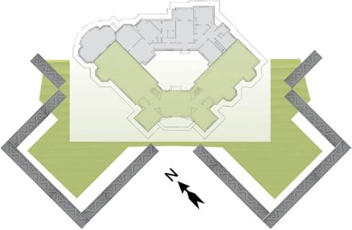 1. La orientación noreste-sudoeste del eje estructural del edificio es la que establece una plantación visualmente equilibrada dentro del terreno porque, a pesar de que el terreno tiene un lado levemente cóncavo sobre la calle E. del Campo y otro levemente convexo sobre M. de Lavardén, coloca los salones de la biblioteca y el herbario más o menos paralelos a la línea municipal del terreno.