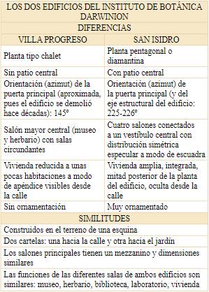 No hay a primera vista un parecido entre el Darwinion de Villa Progreso y el de San Isidro (Tabla 4). A pesar de las diferencias entre ambos edificios, es posible proponer que el de San Isidro es una versión mejorada del primer Darwinion de Villa Progreso. De hecho, la existencia de una maqueta del edificio de San Isidro (cfr. Porter, 1933) sugiere que el proyecto tuvo un considerable grado de elaboración.