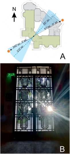 3. La orientación del eje estructural del Darwinion no coincide con los azimuts del amanecer y ocaso del sol en el solsticio de invierno y de verano. Aun así, podría considerarse que el eje estructural del edificio tiene una orientación solsticial simbólica. Bajo esta licencia, el eje estructural del Darwinion estaría señalando el período del año donde la parte iluminada del día comienza a crecer y la duración de la noche comienza a disminuir hasta alcanzar el día con mayor cantidad de horas de luz en el solsticio de verano. Así la orientación del Darwinion podría interpretarse, siempre en forma simbólica, como una expresión del período más luminoso del año, donde la luz comienza la derrota de la oscuridad, donde el conocimiento triunfa sobre la ignorancia. De hecho, un observador de pie en el centro del portal puede ver el sol iluminando la puerta principal (Fig. 23) y el emblema del instituto entre el 21 de noviembre y el 21 de enero (con su máxima plenitud en el solsticio de verano). La margarita Leucanthemum vulgare es en sí misma un símbolo solar, y representa la luz y el conocimiento (Chevalier & Gheerbrant, 1990). A pesar de la urbanización y el arbolado que rodea hoy al Darwinion, esta observación es aún hoy día posible (Fig. 23B).