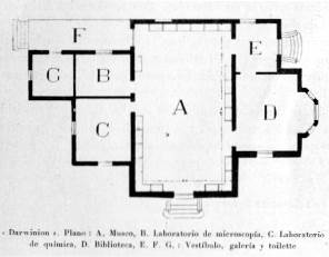 La descripción publicada en Physis (Anónimo, 1912) sobre este primer Instituto de Botánica Darwinion, nos muestra un edificio construido con el propósito principal de disponer un laboratorio-museo botánico, más una función secundaria de vivienda (Fig. 3). En sus comienzos, el alambrado perimetral del Darwinion de Villa Progreso no contaba con un portón hacia la calle (Fig. 4). La entrada al salón del Darwinion (Fig. 4D) daba al jardín, orientada hacia la Casa de Retiros de las Hermanas Adoratrices, en otras palabras, hacia la quinta familiar de los Hicken (Fig. 1). Por esa razón, esa era la entrada más importante del edificio, con cuatro amplios escalones y una pérgola de herrería artesanal sobre el dintel. Sobre esa puerta, y por encima de la pérgola, se podía leer el nombre “Darwinion” con grandes letras de tipografía de palo seco grabadas sobre la pared (Fig. 4D), un letrero muy similar al que hoy vemos en el edificio de San Isidro. El mismo letrero se repetía sobre el muro opuesto, encima de la ventana del salón museo que abría hacia la calle Progreso (Fig. 4A). Este salón museo era el ambiente principal que alojaba la colección del herbario y parte de los libros, y tenía una mesa y sillas para el estudio del material botánico (Fig. 5A-B). Alrededor de este salón se conectaban: una sala de biblioteca, un laboratorio de microscopía, uno de química, una galería con salida al jardín sobre la calle Progreso (lado NO del edificio), y un pequeño vestíbulo con salida hacia la calle Heredia (lado NE del edificio) (Fig. 3). Poseía además un laboratorio fotográfico, y algunas habitaciones para huéspedes en la planta alta (Parodi, 1961).