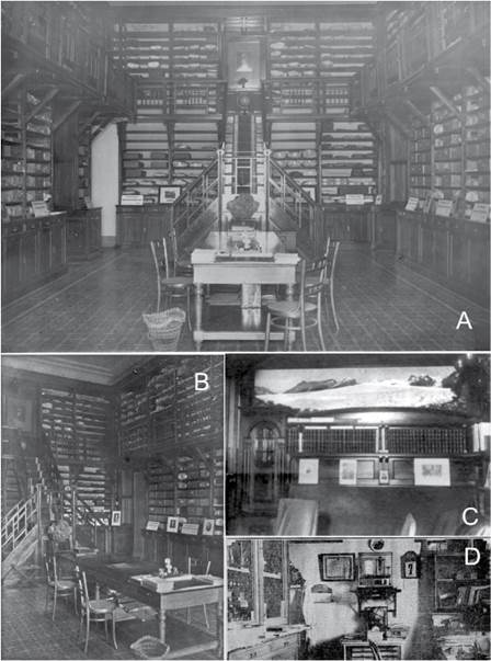 Contamos con 16 fotografías del interior de este primer Darwinion: dos existentes como reproducciones individuales en el archivo del IBODA, dos reproducciones digitales proporcionadas por el Sr. Mariano Ducros, dos publicadas en un artículo del diario La Razón el 4 de enero de 1930, cuatro publicadas con posterioridad al fallecimiento de Cristóbal M. Hicken en un artículo del diario La Prensa del 18 de mayo de 1933, una en un artículo del diario La Nación del 26 de abril de 1934 y cinco en un artículo de Ahora, periódico ilustrado del 12 de agosto de 1935. De acuerdo con estos documentos, el salón museo poseía un gran mueble perimetral con mesada, bajo mesada, y alzada con estantes, en el cual se guardaba la colección del herbario (Fig. 5A-B). Ese mueble fue adaptado e instalado en el sótano del Darwinion de San Isidro (carta del Ing. Eduardo Latzina al Presidente de la ANCEFN, 18-10-1936), y aún hoy está en uso. Se observa también una escalera tapizada con una alfombra que lleva a un mezzanino perimetral.