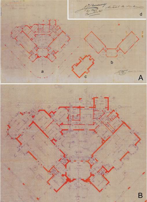 - Tal como se explica detalladamente más abajo, se retiraron cuatro planos y una foja del expediente municipal (“Hicken Construcción” Número 586- Año 1932) supuestamente con la autorización de Cristóbal M. Hicken, lo que deja abierta la posibilidad de que alguno de esos planos llevara la firma de Arturo Prins o Fernando de Estrada.