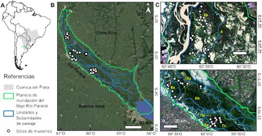 El Paraná es un río de gran extensión y tamaño de cuenca, el segundo en Sudamérica luego del Amazonas en términos de su longitud (Neiff et al., 1994). El presente estudio fue realizado en la región del Complejo Fluvio-Litoral del Bajo Paraná, también conocido como Delta del Paraná, que presenta un extenso mosaico de humedales de 19,500 km2 (Fig. 1). En particular, se trabajó en la porción superior y media del Delta del Paraná. En el área se han identificado unidades de paisaje de humedales con base en los patrones geomorfológicos e hidrológicos (Kandus et al., 2019) (Fig. 1B).