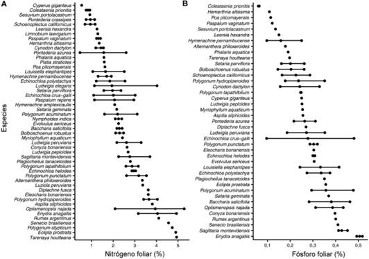 Las 131 poblaciones dominantes analizadas corresponden a 50 especies y 15 familias (Tabla 1). La variabilidad interespecífica fue mayor que la intraespecífica para N (t = -6,22; gl = 24; p < 0,0001), P (t = -2,98; gl = 19; p = 0,0039) y N:P (t = -1,92; gl = 19; p = 0,0352). La concentración foliar de N varió entre 0,47% en Pontederia azurea (Sw.) Kunth (Pontederiaceae) y 5,29% en Oplismenopsis najada (Hack. & Arechav.) Parodi (Poaceae) (Fig. 2A). Por otro lado, la concentración foliar de P varió entre 0,06% en Coleataenia prionitis (Nees) Soreng (Poaceae) y 0,52% en Enydra anagallis Gardner (Asteraceae) (Fig. 2B).