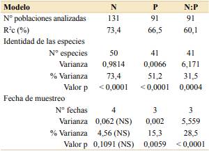 En el caso del N, la identidad de las especies contribuyó a explicar la mayor parte de la varianza (R2c = 73,4% de la variabilidad de N; p < 0,0001 en la prueba ranova). En el caso de P y N:P, contribuyeron a explicar la variabilidad tanto la identidad de las especies como la fecha de muestreo (p < 0,0001 y p = 0,0004 respectivamente), y en ambos casos la identidad de las especies fue la que explicó la mayor parte de la variación. La familia a la que pertenece la especie fue en todos los casos menos explicativa de la variabilidad que la identidad de las especies, por lo cual no se incluyó en los modelos. El coeficiente de determinación del modelo final para el fósforo foliar P fue R2c = 66,5% (porcentaje de la varianza explicada por la identidad de las especies y por la fecha de muestreo, ver detalle en Tabla 2), mientras que sólo las especies explicaron 56,3% y sólo la fecha de muestreo explicó el 12,8% de la variabilidad total. Para el N:P el R2c fue 53,6% (Tabla 2) (sólo las especies explicaron el 53,6% y sólo la fecha de muestreo explicó el 36,4% de la variabilidad total).