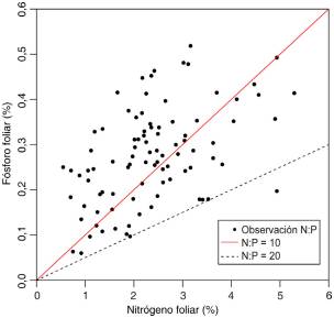 En laboratorio, se secaron las hojas en estufa durante dos días a 72 °C y luego se molieron a 2 µm, de manera que se obtuvo una muestra compuesta para cada población. Para cada nutriente se analizaron 500 mg de material molido y seco. El N foliar fue determinado en todas las poblaciones y el P en 91 poblaciones. El nitrógeno total foliar fue cuantificado con el método Kjeldahl y el fósforo total foliar por medio de incineración en seco seguida del método de Barton (determinación del complejo vanadomolibdofosfórico con espectrofotómetro a 440 nm) (Ritas & Melida, 1990). Las concentraciones de N y P foliar se expresan como mg de nutriente por cada 100 mg de tejido foliar y los N:P se expresan en masa (mg/mg).