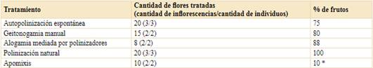 Todos los tratamientos realizados para evaluar autocompatibilidad y alogamia superaron el 75% de fructificación, excepto el tratamiento para evaluar apomixis que alcanzó un 10% de fructificación (Tabla 2), difiriendo significativamente del resto (Xi2 = 31,512; p < 0,0001).