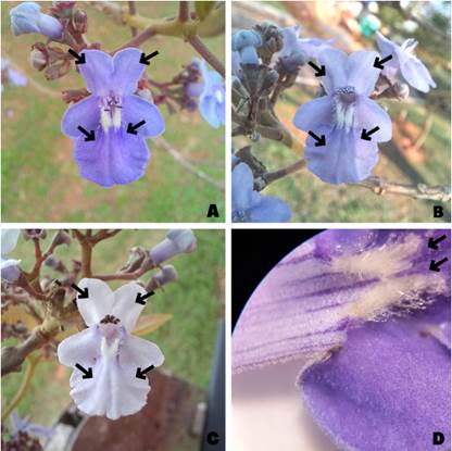 Atractivos visuales y táctiles. En el espectro visible, las flores de V. cymosa varían desde azul (muy pálido o muy claro) a azul purpúreo (muy pálido o muy claro) (Fig. 8A-C); esto fue observado en diferentes flores en la misma fase floral, en el mismo individuo; es decir, distintas flores presentaron distinto grado de saturación. Cualquiera fuera la saturación, ésta fue más o menos uniforme en toda la corola, con excepción de unas zonas, en apariencia más oscuras, producto de unos pliegues convergentes hacia el centro de la flor en los dos lóbulos del labio superior, así como en ambos hemilimbos del labio inferior (Fig. 8A-C). El interior del tubo corolino es blanco, con estrías longitudinales azul purpúreas (Fig. 8D).