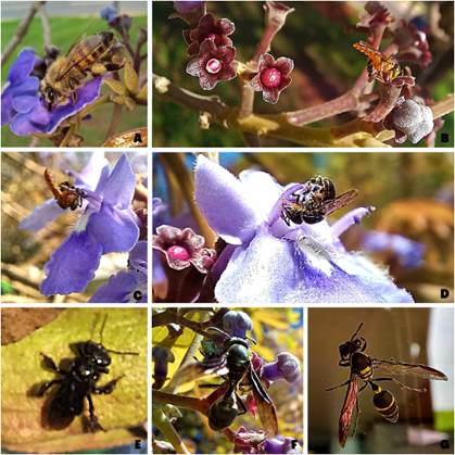 Durante todo el período de floración las visitas fueron asiduas, desde el amanecer hasta el atardecer. El visitante floral más frecuente fue Apis mellifera, que libó legítimamente en promedio 11 flores por minuto, depositándose el polen en forma nototriba, sobre la cabeza (Fig. 9A). El segundo visitante floral más frecuente fue Tetragonisca fiebrigi; los individuos de esta especie, además de las visitas legítimas de libación, a veces libaban el néctar expuesto una vez caída la corola (Fig. 9B) o colectaban polen en forma ilegítima posados sobre las anteras (Fig. 9C). Los demás visitantes fueron registrados ocasionalmente: Plebeia sp., además de las visitas legítimas, realizó algunas visitas ilegítimas posándose sobre las anteras y colectando polen (Fig. 9D); Trigona sp. (Fig. 9E) visitó siempre en forma legítima. Las avispas (Fig. 9F-G), además de visitar las flores, tanto durante la antesis como luego de la abscisión de la corola, recorrían las inflorescencias.