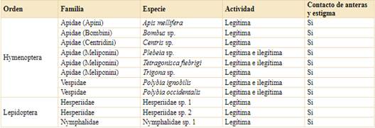 Fueron registradas e identificadas 11 especies de visitantes florales (Tabla 3). Todas realizaron visitas legítimas, contactando los ciclos reproductivos; sin embargo, en algunas oportunidades, individuos de Tetragonisca fiebrigi, Plebeia sp. y las especies de avispas realizaron visitas ilegítimas.