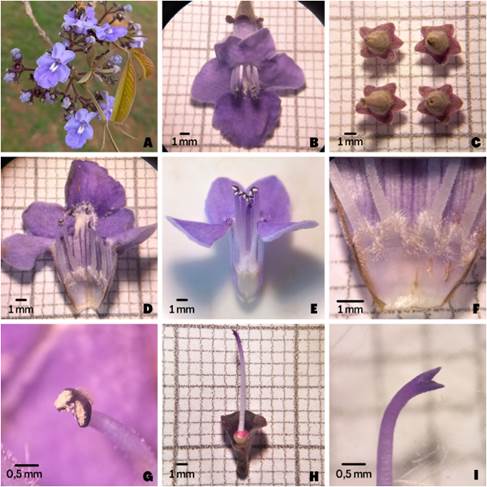 Morfología de la inflorescencia, de la flor y del fruto. Inflorescencias (Fig. 1A) en cimas dicasiales laxas, axilares a subterminales, de 20-40 mm de longitud, con brácteas y bractéolas hasta 2 mm, lanceoladas, caducas; pedúnculos hasta 20 mm de longitud, flores patente-péndulas, 5-8 abiertas simultáneamente. Flores (Fig. 1B) marcadamente zigomorfas, con pedicelos de 3-5 mm. Cáliz (Fig. 1C) de 3 mm de longitud, campanulado, con 5 dientes anchos, subiguales, tomentoso externamente y glabro en el interior. Corola (Fig. 1D-E) tubular-bilabiada; tubo 6-7 mm de largo, cilíndrico, algo ensanchado hacia el ápice; limbo oblicuo en relación al tubo, extendido, elíptico, con el eje mayor de 1,5 mm y el menor de 1,2 mm; labio superior 2-lobulado, el inferior 3-lobulado; los lóbulos finamente papilosos y con pubescencia glandular, redondeados, el central inferior mayor, orbicular, de unos 7 mm de diám., irregularmente crenulado, viloso, de color azul (muy pálido o muy claro) a azul purpúreo (muy pálido o muy claro), con una mácula blanca de forma bilobada en la entrada al tubo. Estambres 4, didínamos, 2 de 7 mm y 2 de 9 mm de largo, adnatos en su base al labio superior, emergiendo de la porción media del tubo corolino o un poco por debajo de este punto, levemente por encima del estigma, exertos; filamentos filiformes, hirsutos en la base y cubiertos de tricomas glandulares hacia el ápice (Fig. 1E-F); anteras de 1 mm de largo, dorsifijas, oblongas, de color azul purpúreo profundo, dehiscentes hacia el labio inferior (Fig. 1G). Ovario súpero de 1,5 mm de longitud, globoso, con el ápice púrpura y la zona media y basal blanco-amarillentas, 2-carpelar, los carpelos 2-loculares y 2-ovulados; estilo de 5 mm de longitud, terminal, filiforme (Fig. 1H); estigma cortamente bífido, con las ramas agudas, subiguales (Fig. 1I); estigma y ápice del estilo azul purpúreo, aclarándose hacia su base hasta blanco (Fig. 1H, I). Fruto drupa de 2-2,5 cm de largo, globosa a obovoide, de color rojo purpúreo oscuro y caedizo a la madurez, con cáliz persistente, cupuliforme, pulpa suculenta; pirena ósea única, 4-locular, 4-seminada (Fig. 5F).