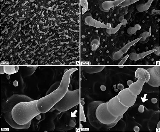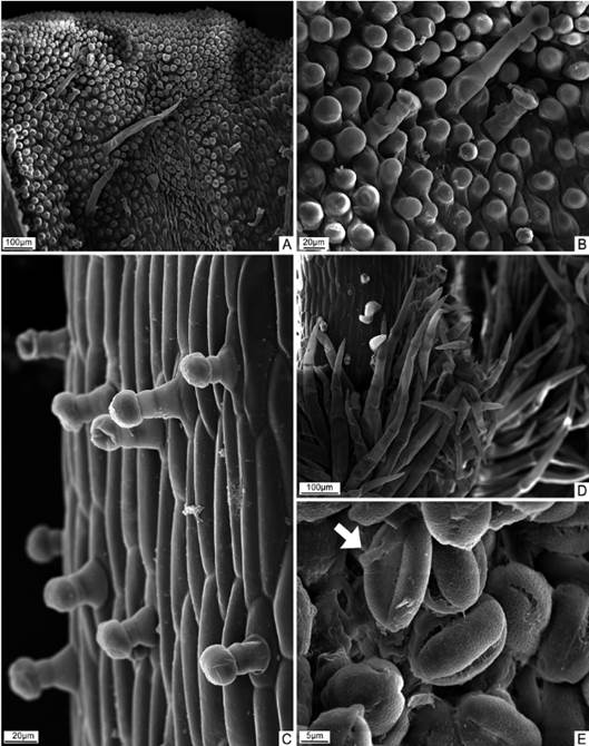 Características epidérmicas de la corola y el androceo. Las células pavimentosas del limbo presentan papilas pequeñas (Fig. 2A-D), mientras que el interior del tubo corolino está completamente recubierto por papilas de mayor tamaño (Fig. 3A-B). Existen pelos en la superficie del limbo (Fig. 2A-D), en el interior del tubo corolino (Fig. 3A-B), a lo largo de los filamentos estaminales (Fig. 3C) y en la base de éstos (Fig. 3D). Los pelos de la superficie del limbo son, en su mayoría, atenuados y algunos glandulares (Fig. 2A-B); todos tienen una hilera de células: los atenuados, conformados por 3-4 células, alcanzan 120 μm de longitud (Fig. 2C), mientras que los glandulares, con 4-7 células, alcanzan 90 μm de longitud (Fig. 2D). Los pelos del interior del tubo corolino son escasos, tanto los atenuados (Fig. 3A) como los secretores (Fig. 3B), alcanzando una longitud de hasta 320 μm. Los filamentos estaminales están cubiertos de pelos glandulares dispersos, de 30-50 μm de longitud, conformados por 3-5 células (Fig. 3C), mientras que en su base existe un cúmulo de pelos atenuados de ca. 600 μm de longitud (Fig. 3D). Todos los estambres ofrecen polen: éste es prolado, de 20 μm de diámetro polar x 15 μm de diámetro ecuatorial, tricolpado, con perforaciones simples, más o menos circulares o elongadas (éstas últimas aparentemente coalescentes), algunas incompletas; presenta cemento polínico (Fig. 3E).