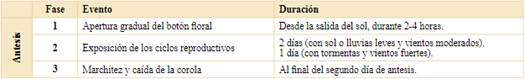 La primera implica la apertura gradual del botón floral; inicia con la salida del sol y se desarrolla durante 2-4 horas. Los lóbulos de la corola se abren sucesivamente: primero se separa el labio superior, y luego se extienden uno tras otro los lóbulos del labio inferior. La segunda fase, o antesis propiamente dicha, tiene una duración de dos días (con clima soleado o bien con lluvias leves y vientos moderados). El polen se expone durante toda la antesis y las tecas se deshidratan progresivamente. El estigma presenta sus ramas separadas durante todo este período, sugiriendo receptividad estigmática. La tercera y última fase implica la marchitez y caída de la corola; al final del segundo día de antesis, la corola se deshidrata progresivamente hasta su caída, quedando el cáliz persistente y el ovario expuesto, si hubo fecundación. En resumen, la longevidad floral es de dos días bajo condiciones meteorológicas favorables (permaneciendo las flores en fase 2 la mayor parte de ese tiempo, es decir, con capacidad de exportar y de recibir polen).