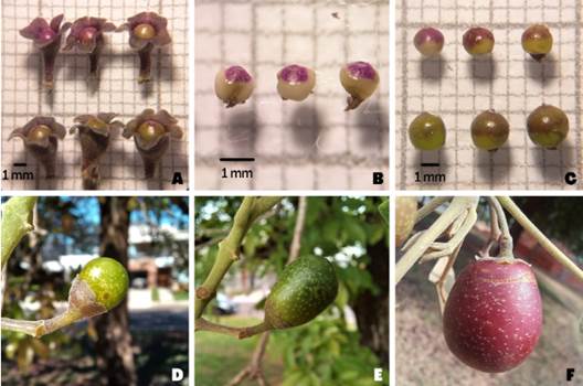 Después de la culminación de la antesis y cuando la fecundación fue exitosa, el cáliz contiene al ovario en crecimiento (Fig. 5A), cuya zona apical púrpura (Fig. 5B) se va expandiendo hacia la base, tornándose más clara, mientras la base se torna más oscura (Fig. 5C), adquiriendo una coloración homogénea, verde-amarillenta primero (Fig. 5D) y verde después (Fig. 5E), con máculas blancas. La tasa de crecimiento del fruto fue de 0,75 ± 0,11 mm (n = 16) por día; una vez que los frutos alcanzaron unos 18-20 mm de longitud comenzaron a adquirir mayor suculencia, pero sin aumentar su longitud. A los 50 días de iniciada la floración, los primeros frutos se encontraban aún verdes, pero ya con la longitud final. El desarrollo de suculencia y la maduración del fruto tuvo una duración aproximada de 25-30 días, hallándose frutos maduros entre finales de diciembre y principios de enero (Fig. 5F).