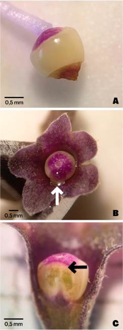 Nectarios y néctar. El néctar es secretado por la zona púrpura del ápice del ovario (Fig. 6A) en forma de gotas dispersas que eventualmente coalescen en gotas de mayor tamaño, y se acumula en la base del estilo, sobre el ovario (Fig. 6B), alcanzando en ocasiones la entrada del tubo; también puede encontrarse disponible y expuesto después de caída la corola. El tejido nectarífero estaría ubicado por debajo de dicha zona (Fig. 6C). El néctar se libera a través de nectarostomas (puntos blancos en la zona púrpura; Figs. 6B y 7A), levemente elevados sobre la epidermis, no todos abiertos (Fig. 7B), de estructura paracítica (Fig. 7C-D).