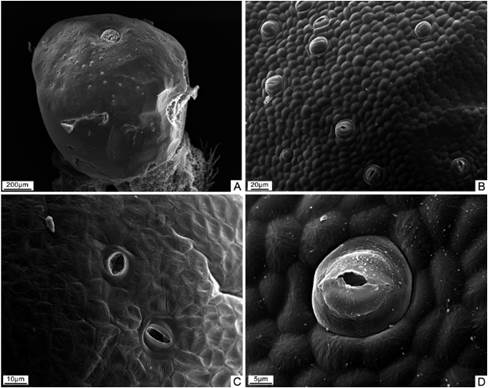 Morfología de la flor. Se describieron las características y disposición de las piezas florales, determinando el tipo floral estructural, a través de la observación directa de flores frescas, disecciones de las piezas y uso de microscopio estereoscópico (ME). Para la descripción micromorfológica, se tomaron imágenes con microscopía electrónica de barrido (MEB), para lo cual flores frescas fueron fijadas en etanol 70%, posteriormente deshidratadas en una serie creciente de etanol (85% y 100%) y luego secadas a punto crítico (Sorrivas de Lozano & Morales, 1986). Las muestras fueron montadas en láminas de aluminio con cinta doble faz y luego metalizadas con oro utilizando un equipo Denton Vacuum Desk II. La observación del material se realizó en un microscopio electrónico de barrido JEOL 5800LV. Las imágenes fueron capturadas con un digitalizador Gatan model 788 Digiscan II. La terminología adoptada para la descripción de los tricomas siguió a Payne (1978).