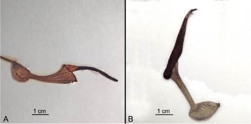 Aristolochia L. consists of approximately 550 known species, widely distributed in the world, with a high diversity in tropical regions, especially in the Neotropics. They are mainly twining vines, but also shrubs and geophytic herbs, that grow in a wide variety of climates and ecosystems, from xerophytic environments to very humid forests. The flowers are epigynous, apetalous, protogynous and monosymmetrical; the perianth is formed by three sepals fused into a variously-shaped tubular structure, usually divided into three main portions (a proximal, inflated utricle, a middle tube, and a distal, flared limb, often adorned with various projections). The number of stamens [usually either 5 or 6, but up to 24 in the paleotropical subgenus Pararistolochia (Hutch. & Dalziel) O.C. Schmidt] almost always matches the number of carpels; the sessile anthers are adnate to the outer surface of the stigmatic lobes, forming a coroniform gynostemium. The fruits are septicidal capsules (González, 1990; González & Stevenson, 2002; Wanke et al., 2006; González & Pabón-Mora, 2017).