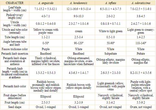 At first sight, Aristolochia hondurensis can appear somewhat intermediate between A. anguicida and A. odoratissima, and could conceivably be taken to represent a natural hybrid between those two species. However, the pedicel plus ovary, the utricle, and the tube of A. hondurensis are significantly longer and larger than those of either A. anguicida or A. odoratissima (Table 1). Also, if A. hondurensis was their hybrid, its fruits would be expected to be intermediate in shape between those of A. anguicida and A. odoratissima (the fruits of the latter are narrowly cylindrical); however, the fruits of A. hondurensis are very similar to those of A. anguicida, only slightly larger (Table 1). Both A. anguicida and A. odoratissima are widespread in the Neotropics (the former from Mexico to Venezuela and the Lesser Antilles, and the latter from Mexico to Argentina and the Antilles), and no other plants similar to A. hondurensis have been documented in their regions of sympatry. Finally, while A. anguicida occurs sympatrically with A. hondurensis in Esquías, A. odoratissima was neither seen nor has it been collected at that locality (see examined specimens of A. anguicida and A. odoratissima from Honduras, below). Thus, we think it is improbable that A. hondurensis represents a natural hybrid between A. anguicida and A. odoratissima.