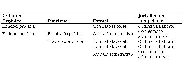 Teniendo en cuenta que en asuntos laborales hay dos jurisdicciones que podrían ser competentes —pero son excluyentes—, para su correcta elección se debe atender a tres criterios: el orgánico, el funcional y el formal; el primero se refiere a la entidad o empresa contratante o vinculante, el segundo a las actividades o funciones desarrolladas por el trabajador o servidor público, mientras que el tercero se refiere a la forma de vinculación con la entidad. Así entonces, atendiendo al criterio orgánico, si la entidad es privada, la jurisdicción competente es la laboral; si la entidad es pública, se deberá diferenciar qué tipo de servidor público es: si es empleado público, la jurisdicción competente será la contencioso administrativa; pero si es trabajador oficial, la jurisdicción será la ordinaria laboral. Frente al criterio formal, en los casos en que exista un contrato de trabajo, la Corte Constitucional de Colombia ha sido enfática en que la competencia radica en la jurisdicción ordinaria laboral. En la tabla 1 se presentan los criterios mencionados.