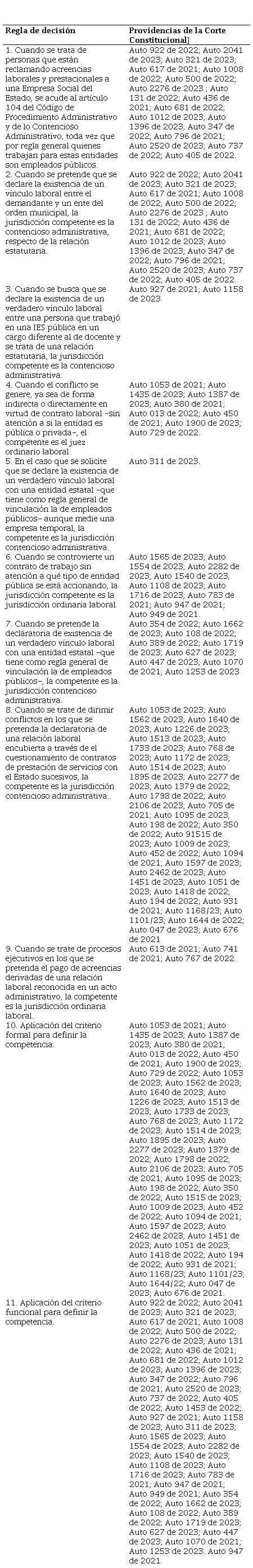 En síntesis, se encontró que en algunos casos la Corte Constitucional hace caso al criterio formal, es decir, a la forma de vinculación, ya sea por acto administrativo de nombramiento, por contrato de trabajo o por contratos sucesivos de prestación de servicios que pretenden la declaratoria del vínculo laboral, para determinar cuál es la jurisdicción competente para conocer de la controversia, sin atención a las funciones que cumple el trabajador en la entidad pública (numeral 10). Sin embargo, la Corte también aplica el criterio funcional para determinar la jurisdicción correspondiente, es decir, analiza si se trata de funciones de un empleado público o un trabajador oficial para establecer si el juez competente es el ordinario laboral o el contencioso administrativo (numeral 11).