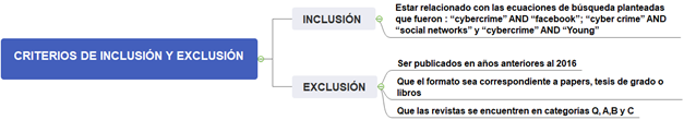 Posteriormente, a los 363 artículos se les aplicaron los siguientes criterios de exclusión: estudios publicados en años anteriores al 2016, que el formato sea correspondiente a los paper, tesis de grado o libros y finalmente que las revistas se encuentren en categorías Q, A, B y C; en cuanto al idioma, la búsqueda no tuvo delimitaciones y al final se obtuvieron 29 documentos en español, 19 en inglés 1 en alemán y 1 en malayo, las ecuaciones de búsqueda fueron: “cybercrime” AND “facebook”; “cyber crime” AND “social networks” y “cybercrime” AND “Young”.