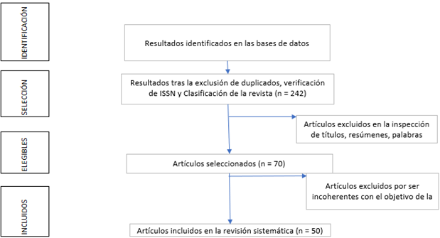 Posteriormente, como segunda fase estuvo la selección, que consistió en verificar el ISSN y la clasificación de la revista y eliminar los artículos duplicados, quedando en 242 artículos; en esta misma fase se leyeron los títulos, los resúmenes, las palabras claves y la metodología implementada, eliminando aquellos que no tenían relación con el objetivo de la investigación, reduciendo a 70 documentos aptos para el estudio y, finalmente, estuvo la fase de inclusión, para lo que se leyeron los documentos completos y se eliminaron aquellos que en sus resultados no tuvieran coherencia con el objetivo planteado. En la figura 2 se ilustran estas fases.