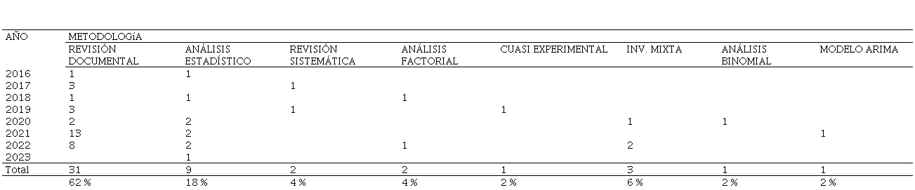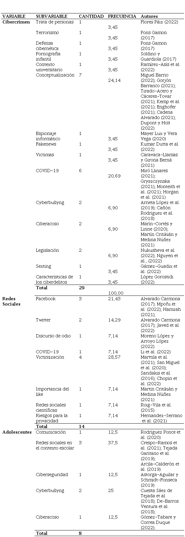 Asimismo, las variables que más se han estudiado y relacionado con los ciberdelitos, son la conceptualización con el 24 % (n = 7) y el COVID-19 con el 20,69 % (n = 6) y las menos estudiadas son la trata de personas, el terrorismo, la defensa cibernética, la pornografía infantil, el contexto universitario, el espionaje informático, los fakenews, las víctimas, el sexting y las características, cada una con un 3,45 % (n = 1).
