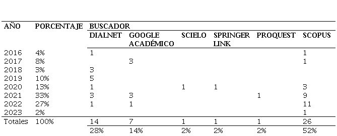 Para lograr el objetivo propuesto, se desarrolló una revisión sistemática de literatura según los lineamientos y las recomendaciones de la Guía para el desarrollo de la metodología PRISMA formulada en 2020 por Page et al. (2021), cumpliendo con los puntos 1-9, 16,17, 23 y 26; para la búsqueda de artículos publicados entre el periodo 2016-2022, que fue realizada en cinco bases de datos Scopus (187), Dialnet (101), Google académico (50), ProQuest (10), Scielo (8) y Springer Link (7); para un total de 363 documentos revisados.