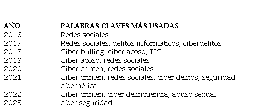 El propósito de esta investigación fue la revisión y síntesis de los estudios que han reportado el uso del constructo ciberdelitos en redes sociales relacionados con adolescentes en el periodo 2016-2022. Los principales artículos analizados indican que existe un gran vacío normativo en cuanto a la regulación de los ciberdelitos; específicamente en aquellos que se dan en el contexto de las redes sociales, el control de los contenidos expuestos es altamente complejo. Esto significa que las leyes y regulaciones actuales no están diseñadas para abordar adecuadamente el problema de los ciberdelitos en las redes sociales; por lo tanto, se requiere una mayor atención y acción en este ámbito en concordancia con lo sostenido por la Cámara Colombiana de Informática y Telecomunicaciones (2021).