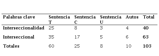 Como se evidencia en la tabla 3, son alrededor de 103 providencias judiciales que ha emitido la Corte Constitucional de Colombia en las que se mencionan las palabras interseccionalidad e interseccional. Es importante resaltar que de 27 388 sentencias proferidas y publicadas por la alta corporación, solo 103 hacen referencia a la interseccionalidad, por lo cual se infiere que el concepto en estudio es relativamente novedoso en la jurisprudencia constitucional.