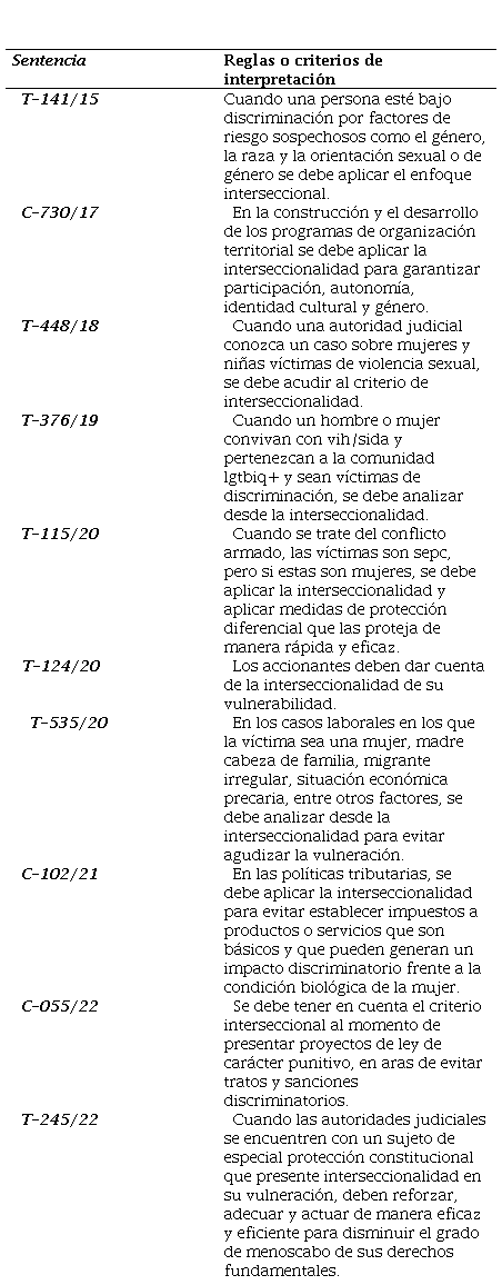 En este punto del texto, se tratará de extraer las reglas o criterios de interpretación que la Corte Constitucional ha construido en su jurisprudencia para desarrollar el principio de interseccionalidad, teniendo en cuenta las anteriores 23 sentencias que se revisaron para esta investigación. La tabla 5 servirá para brindar una mayor comprensión al respecto: