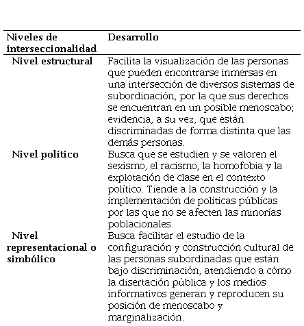 Asimismo, como se ilustra en la tabla 1, se formularon los bien llamados 3 niveles interseccionales de discriminación, con el objeto de comprender en mayor medida la metodología con la que se debe analizar cada caso en particular.