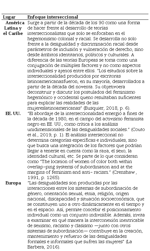 Como se evidencia en la tabla 2, para este texto también es relevante y pertinente incluir la concepción de interseccionalidad desde el punto de vista internacional, es decir, establecer un derecho comparado de cómo surgió y se implementó en las diferentes latitudes el enfoque interseccional.
